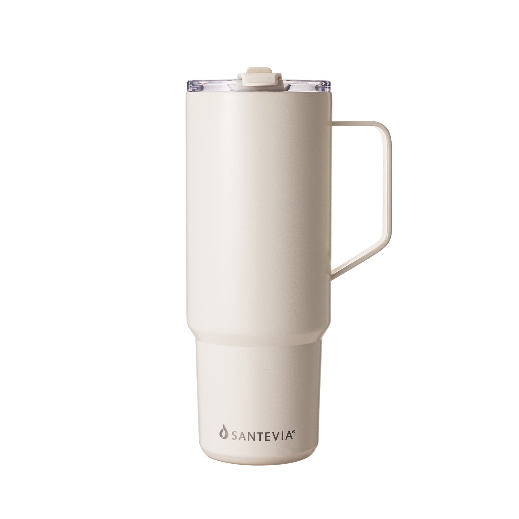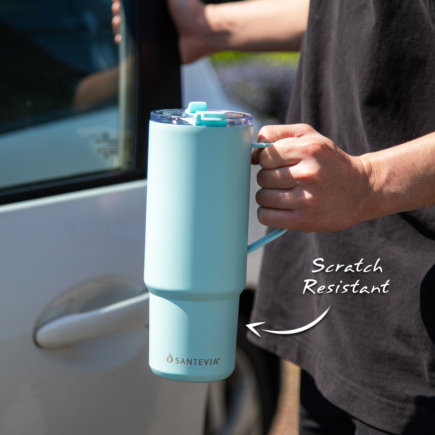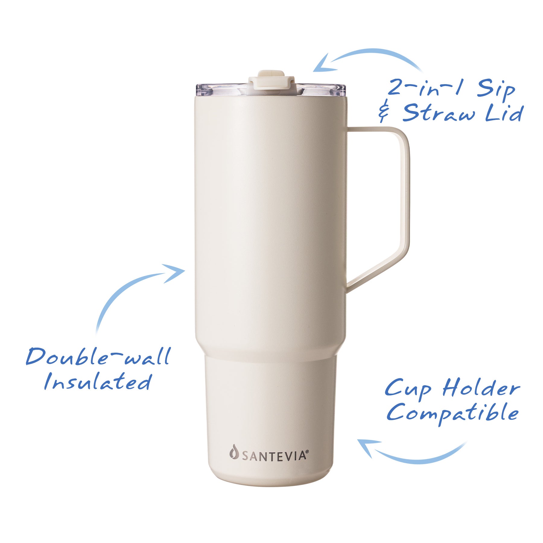 Santevia Tumbloers have a 2-in-1 Sip & Straw lid, are double-wall insulated stainless steel and are cup holder compatible