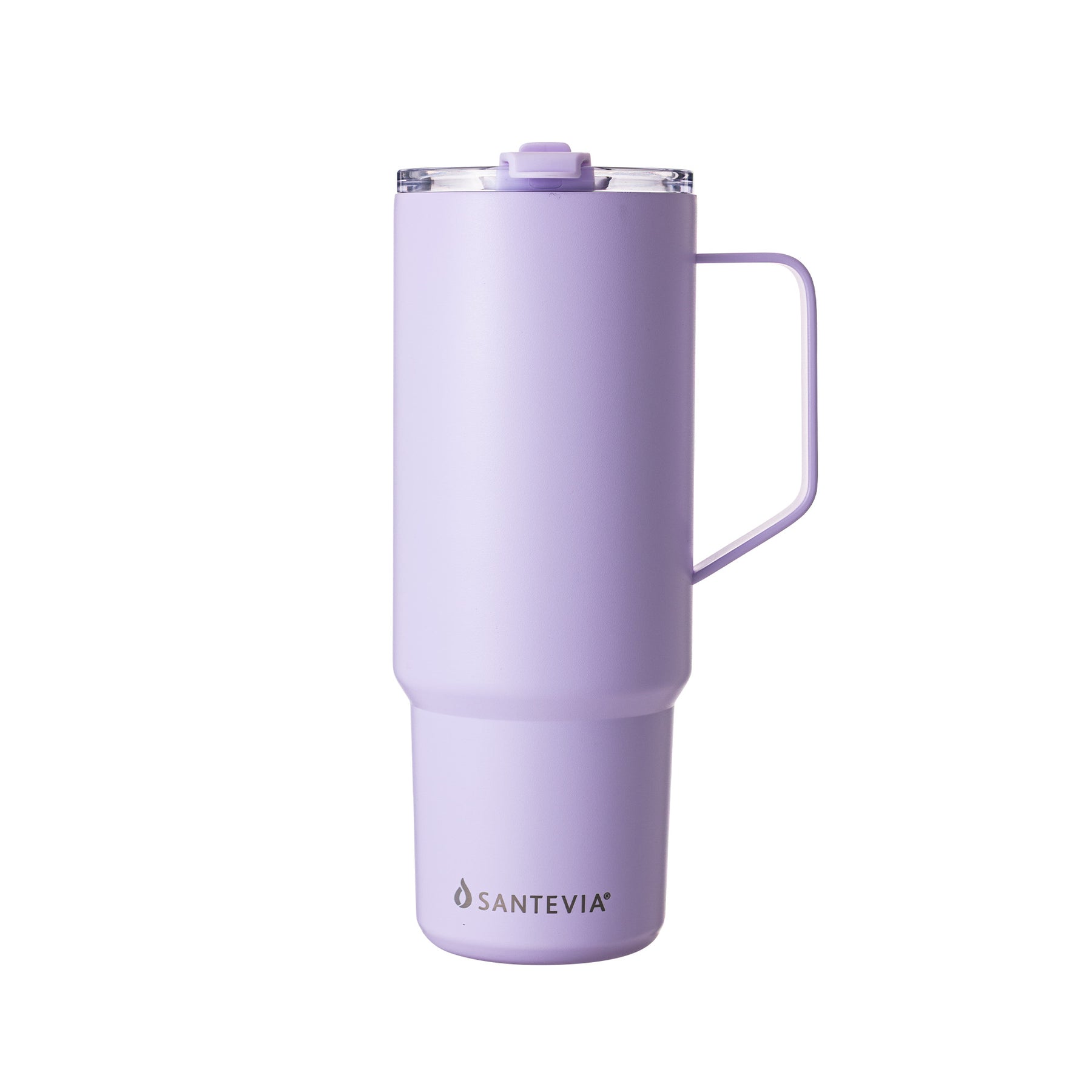 Santevia 900 mL Tumbler Lavender is Easy to Carry, in front of a california lavender flower bush