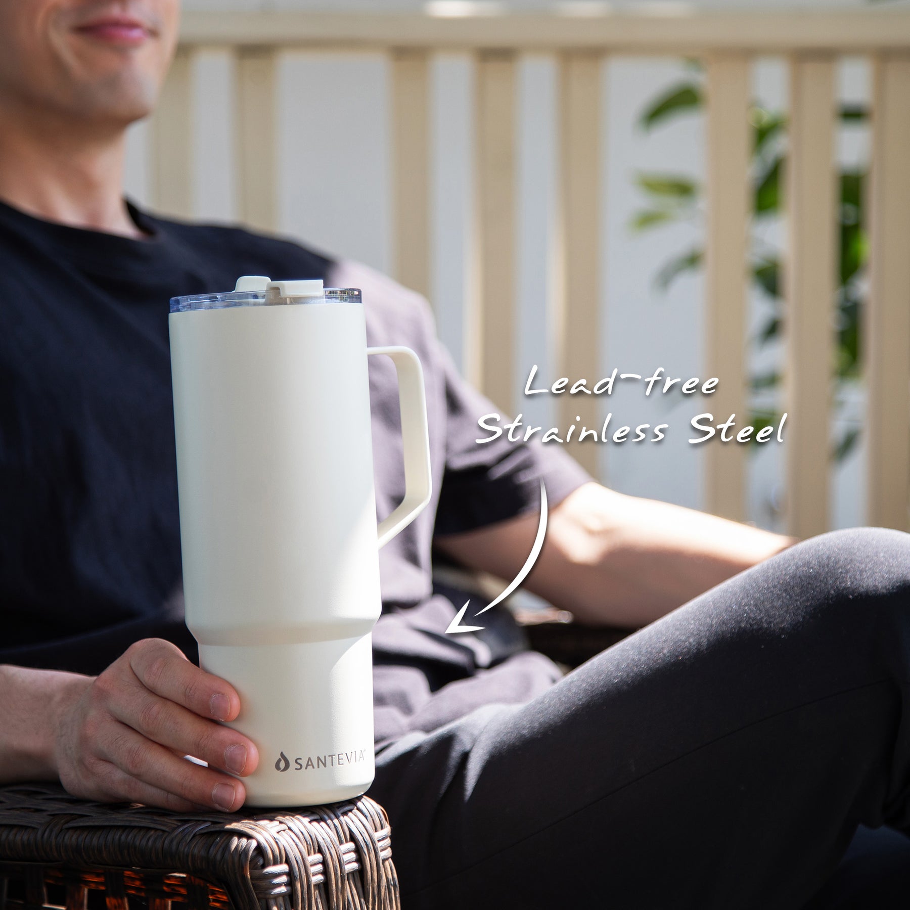 Man on porch smiling with Santevia 900 mL Ivory Tumbler. Lead-free Stainless Steel.
